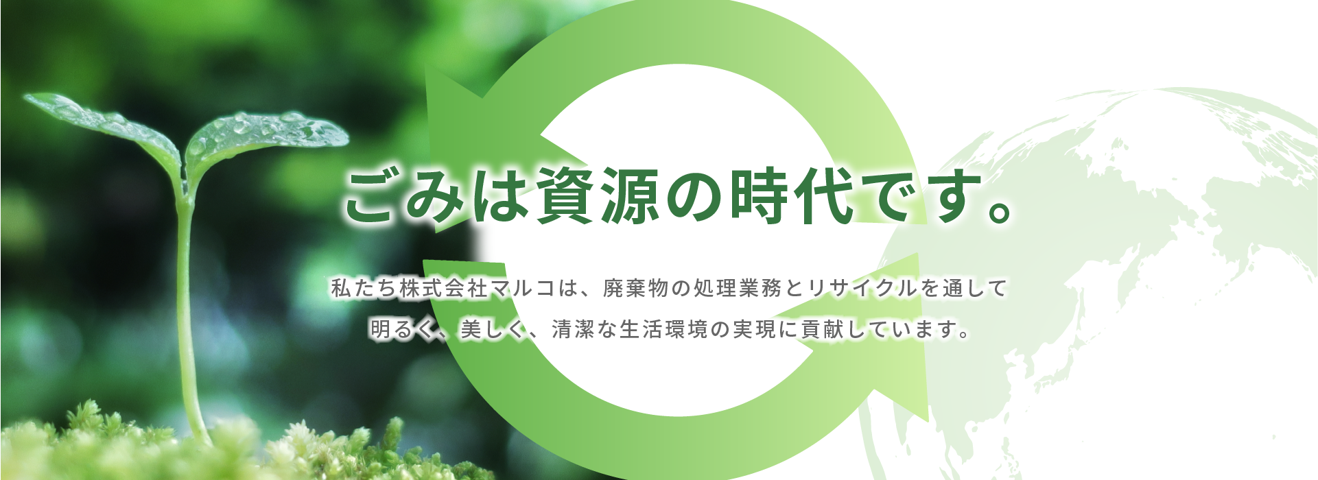 生活様式の多様化や産業の発展に伴う廃棄物の排出量の増加、時代とともに変化する廃棄物の分類や処理方法、また、各市町村ごとの諸事情による廃棄物取扱方法など、私たちはこれらのニーズに柔軟に対応し、皆様の環境負荷の低減に努め、自然環境を守り、明るい社会作りに貢献していきます。 COMPANY 当社について 次の世代により良い環境を 私たちは、持続可能な社会の実現に向け、廃棄物処理のプロフェッショナルとして活動しています。変化する法規制や地域ごとのニーズに対応し、適正かつ効率的な処理体制を構築。安全・安心なサービスを通じて、企業と地域の環境マネジメントを強力にサポートします。 企業情報の詳細はこちら > SERVICE サービス マルコは、家庭ごみから産業廃棄物までのあらゆる廃棄物の収集運搬と中間処理を行っています。 サービスの詳細はこちら > LICENSE DOWNLOAD ライセンスのダウンロード RECRUIT 採用情報 私達とパートナーとして一緒に働きがいのある職場で働いてみませんか? 当社では、未経験・経験など問わずスタッフを募集しております。仲間達と共に様々な経験や学び、挑戦をして成長ができる環境です。やる気のある方・ご興味のある方は、是非お気軽にご連絡ください。 皆様のご応募をお待ちしております! 採用情報の詳細はこちら > CONTACT・ENTRY お問い合わせ 当社に関するお問い合わせは、 お電話もしくはお問い合わせフォームよりお願いいたします。 まずは、 お気軽にお問い合わせください。 TEL : 046-869-5001 受付時間 : 9:00 〜 17:00 お問い合わせフォーム >